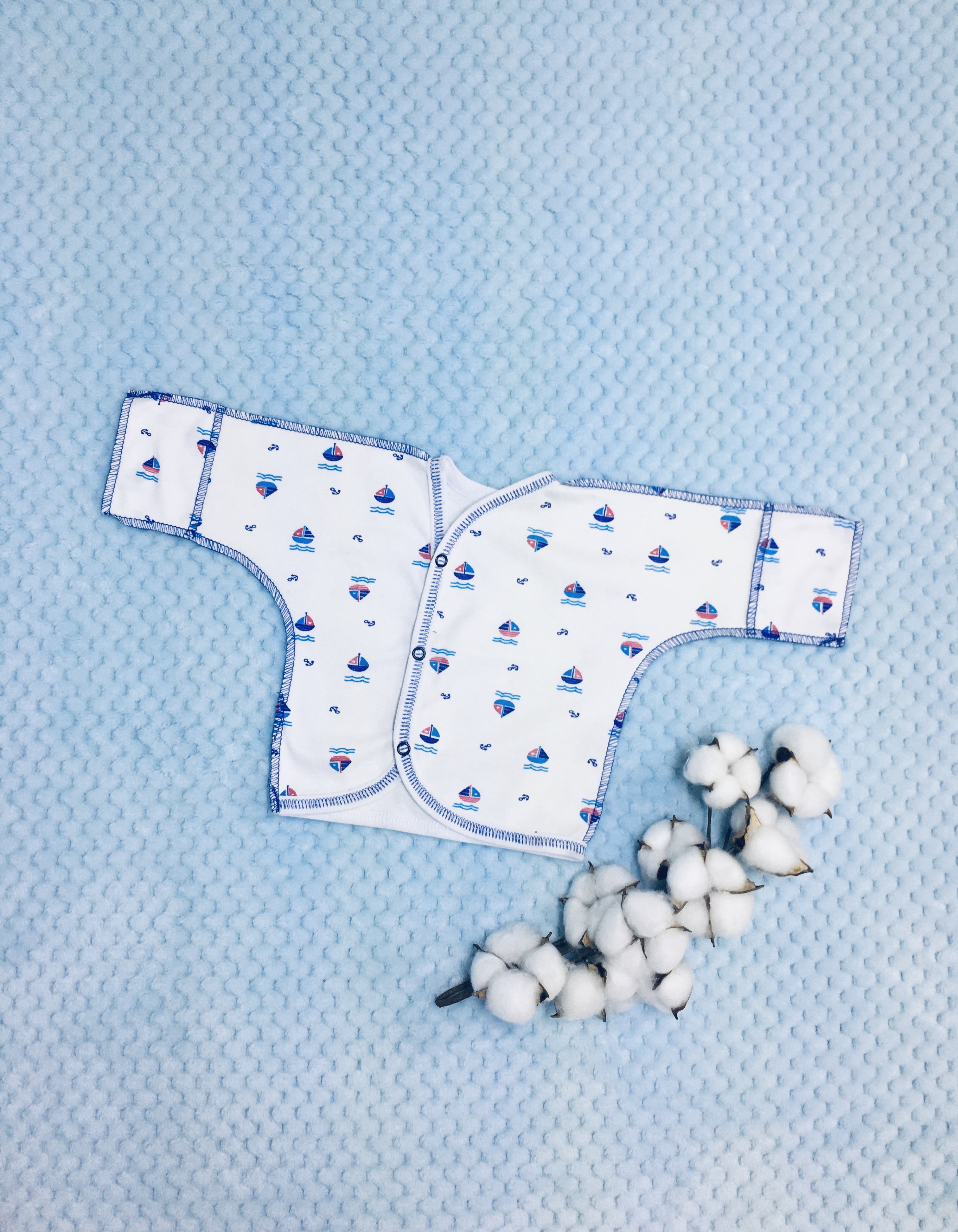 Распашонка выполнена со швами наружу, с рукавчиками-трансформерами, спереди с асимметричной застёжкой на кнопочках.